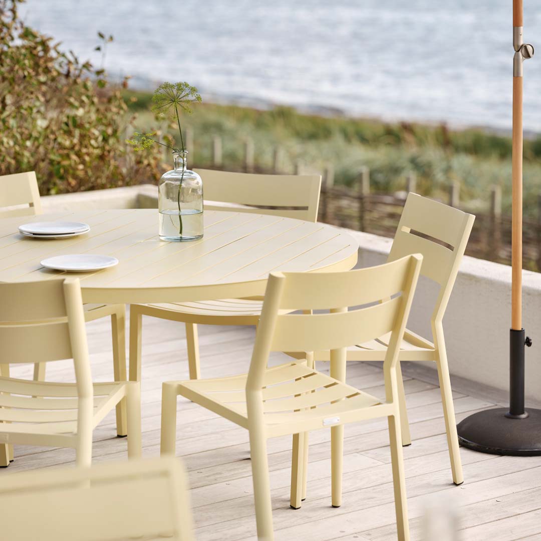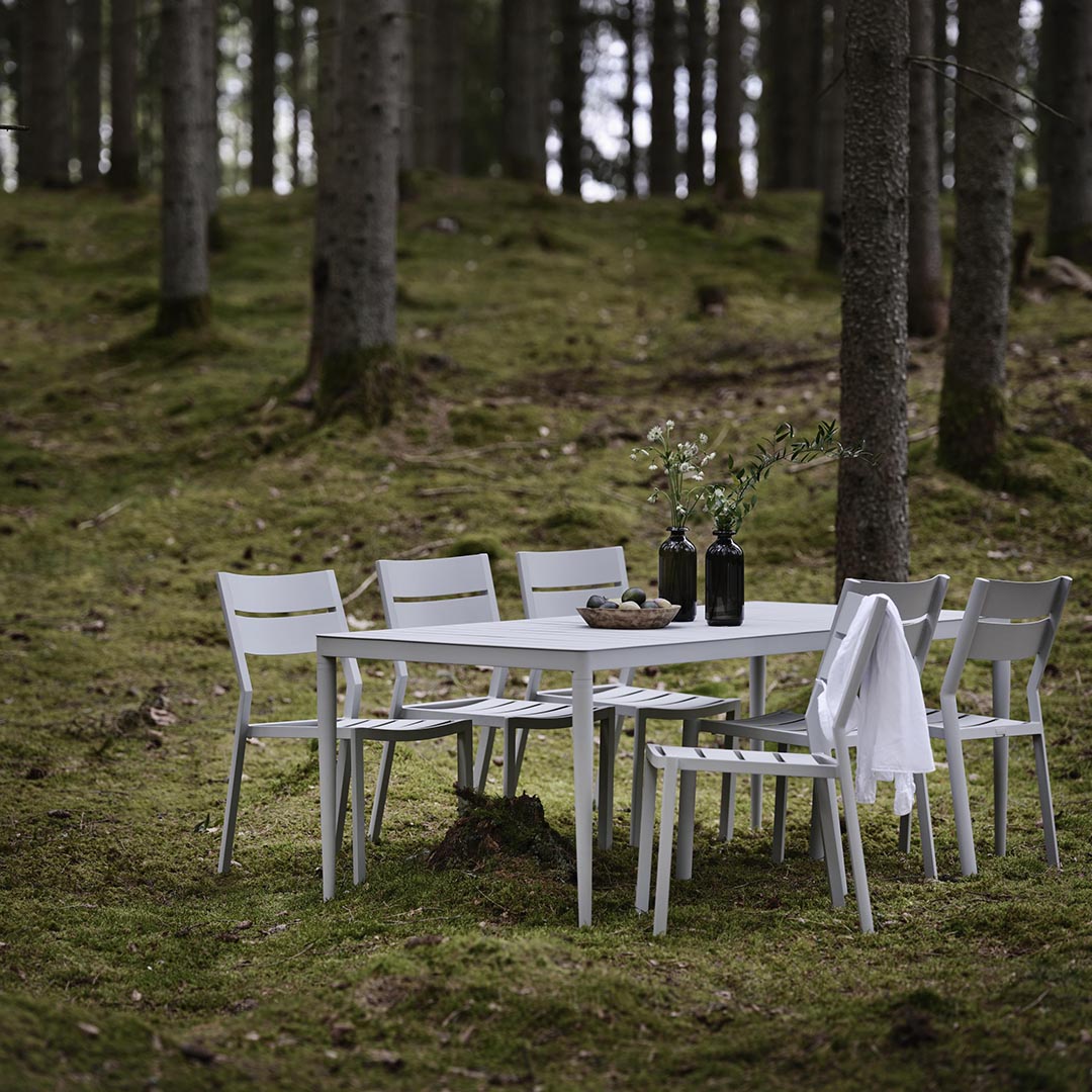 Utebord i aluminium är lätta, rostfria och moderna i uttrycket. De kräver minimalt underhåll och passar perfekt i skandinaviska trädgårdar.