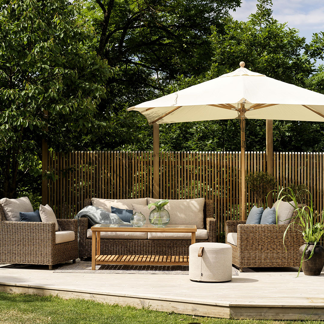 Skapa rumskänsla utomhus genom att komplettera din soffgrupp med en matta för utomhusbruk, sidobord, krukor och lyktor. En eller flera värmande plädar är också trevligt och praktiskt att ha till hands när kvällarna är kyliga.