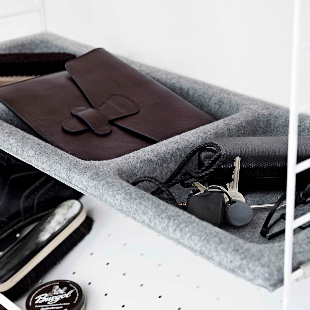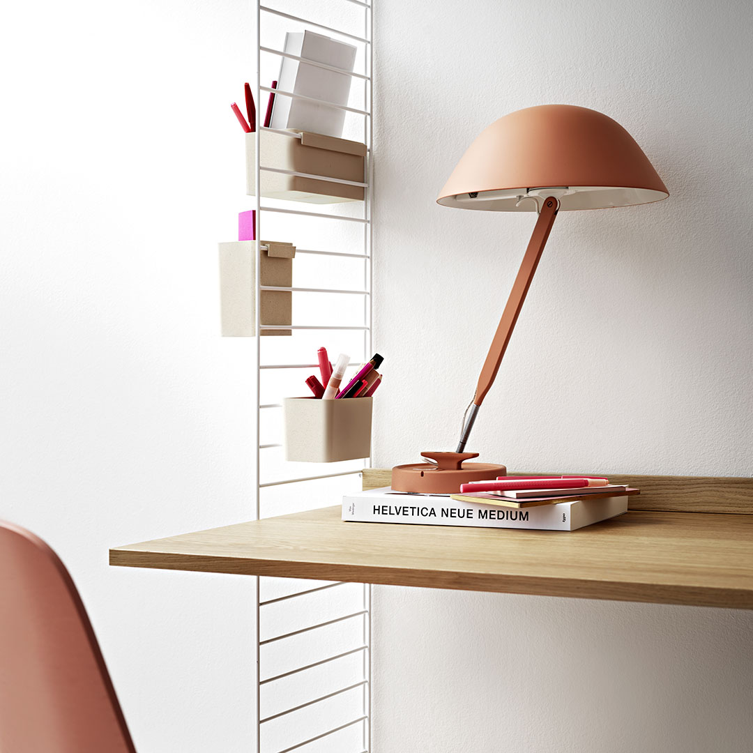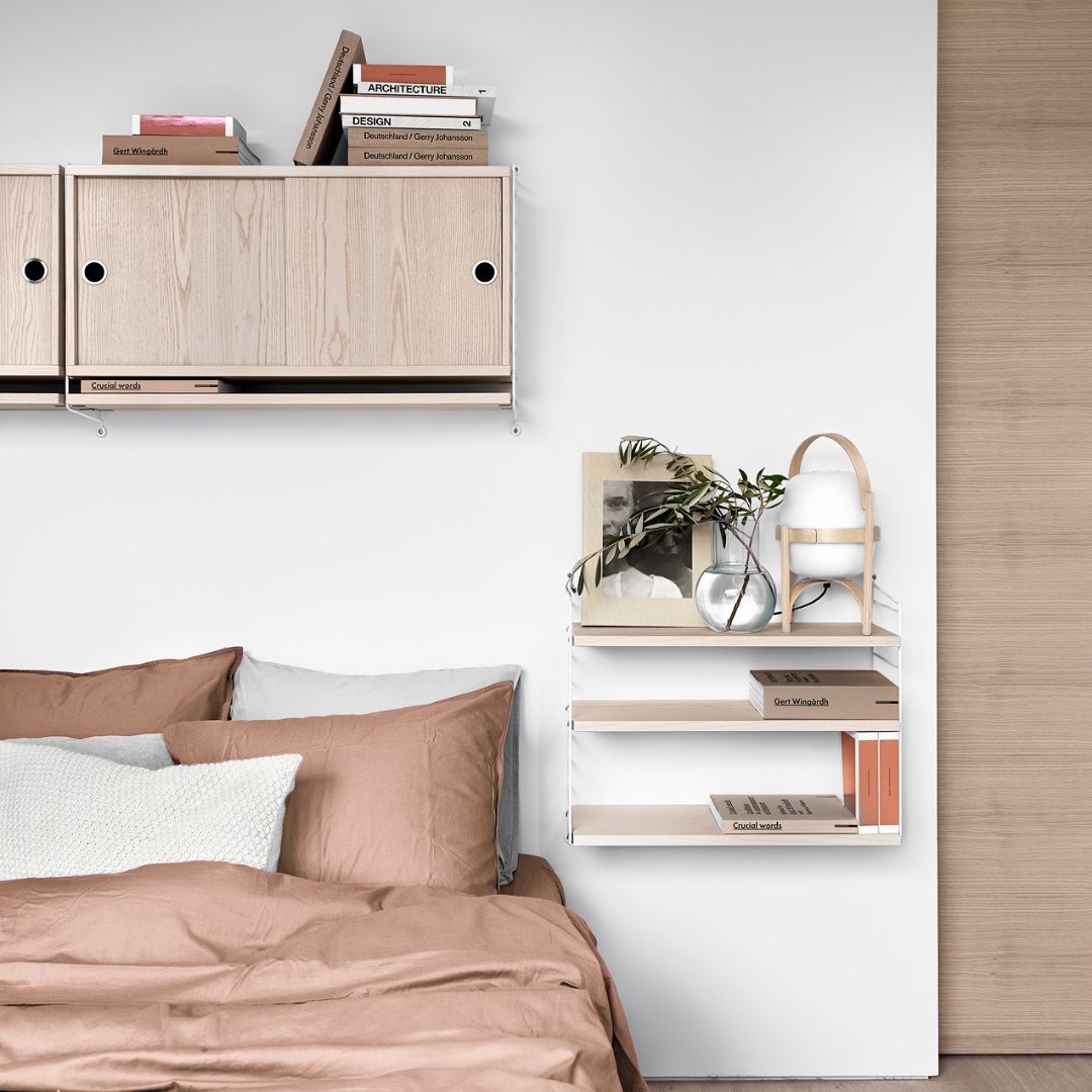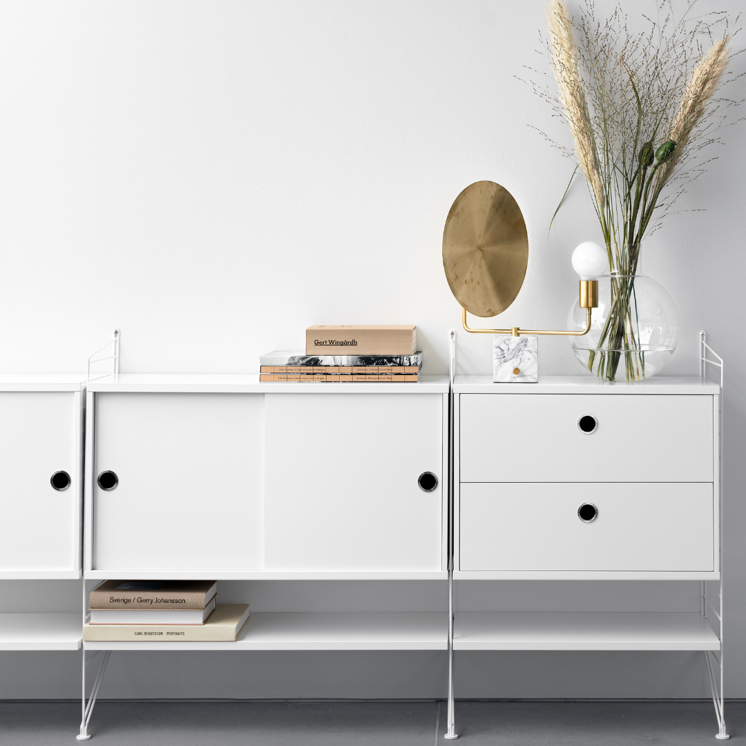 En String-hylla kan se ut och byggas på en mängd olika sätt - det är dina önskemål och din fantasi som sätter gränserna. Välj själv mellan luftiga hyllplan, skåp med lådor eller dörrar, arbetsskivor, tidsskriftshyllor och golv- eller väggavlar. String är helt enkelt uppbyggd av olika enkla moduler där du själv väljer utseende.