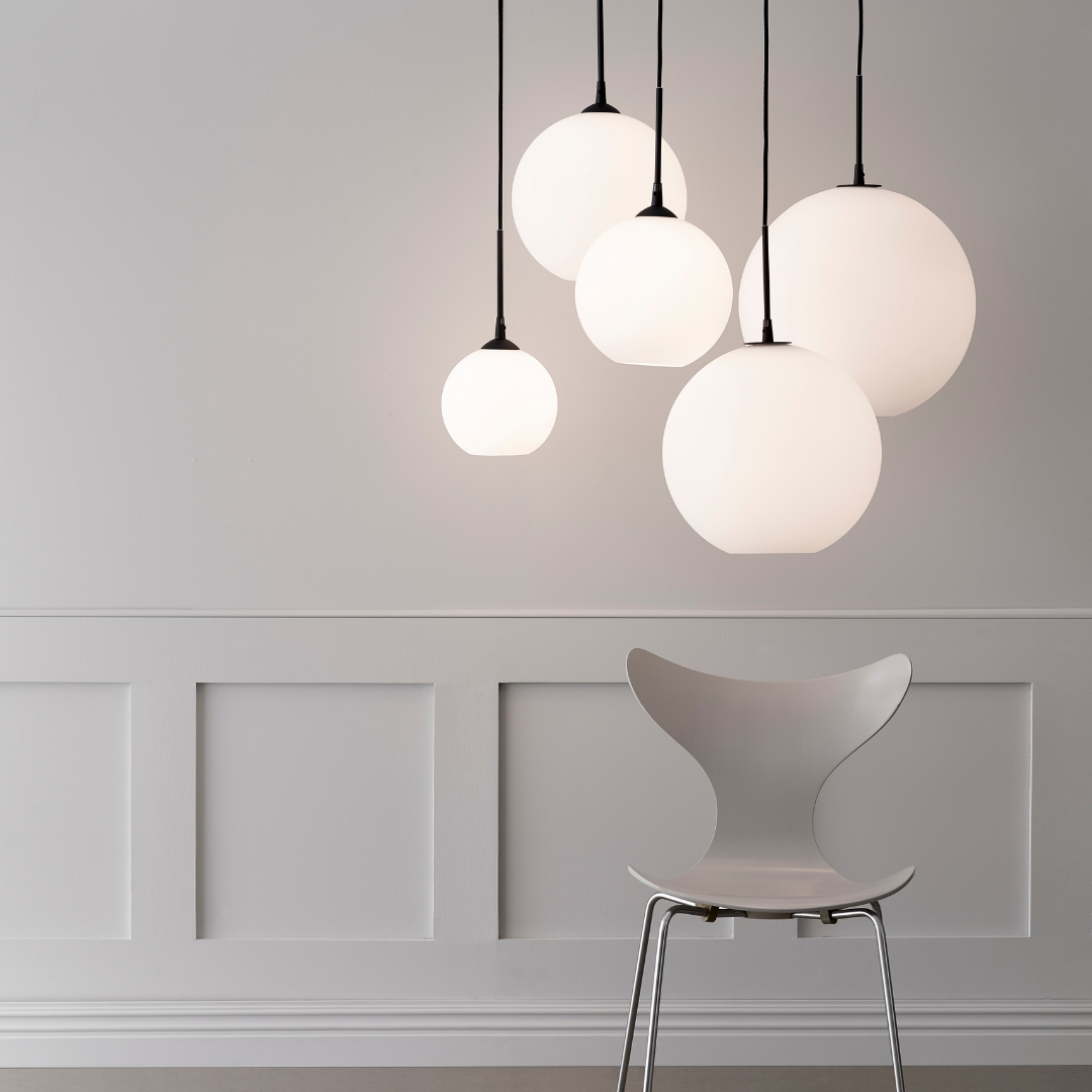 Stilfull och vacker glaspendel som sprider ett behagligt sken genom sitt opalglas. Finns i flera storlekar.