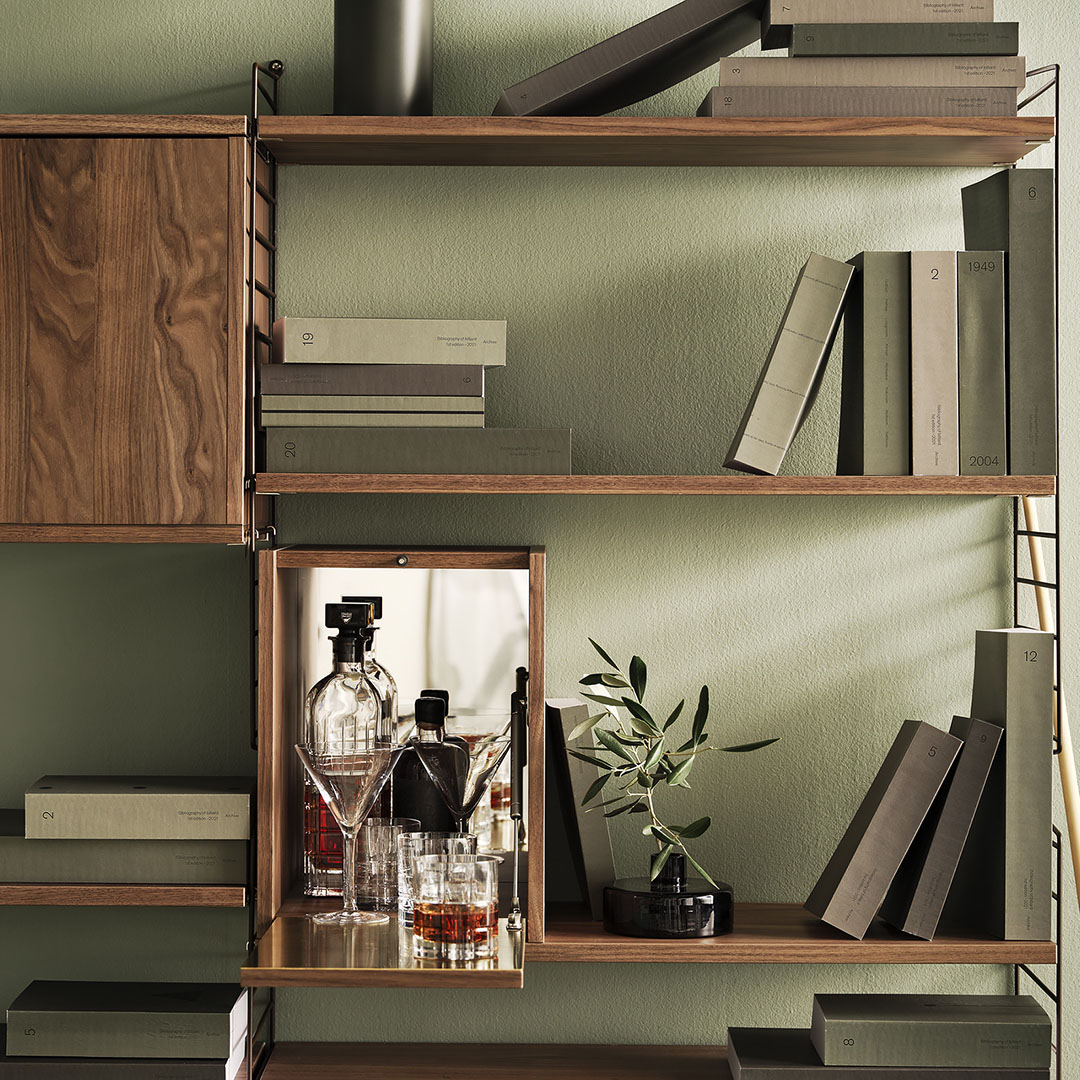 En String-hylla kan se ut och byggas på en mängd olika sätt - det är dina önskemål och din fantasi som sätter gränserna. Välj själv mellan luftiga hyllplan, skåp med lådor eller dörrar, arbetsskivor, tidsskriftshyllor och golv- eller väggavlar. String är helt enkelt uppbyggd av olika enkla moduler där du själv väljer utseende.